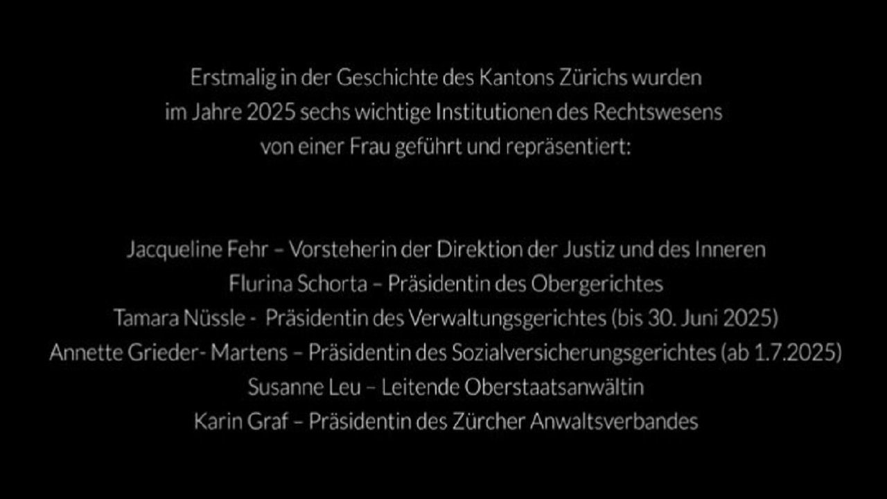 In 2025, the Zurich legal system made a small piece of history: For the first time, six central institutions were simultaneously headed by women – the Justice and Home Affairs Directorate of the Canton of Zurich, the High Court of the Canton of Zurich, the Administrative Court of the Canton of Zurich, the Social Insurance Court of the Canton of Zurich, the Public Prosecutor's Office and the Zurich Bar Association.