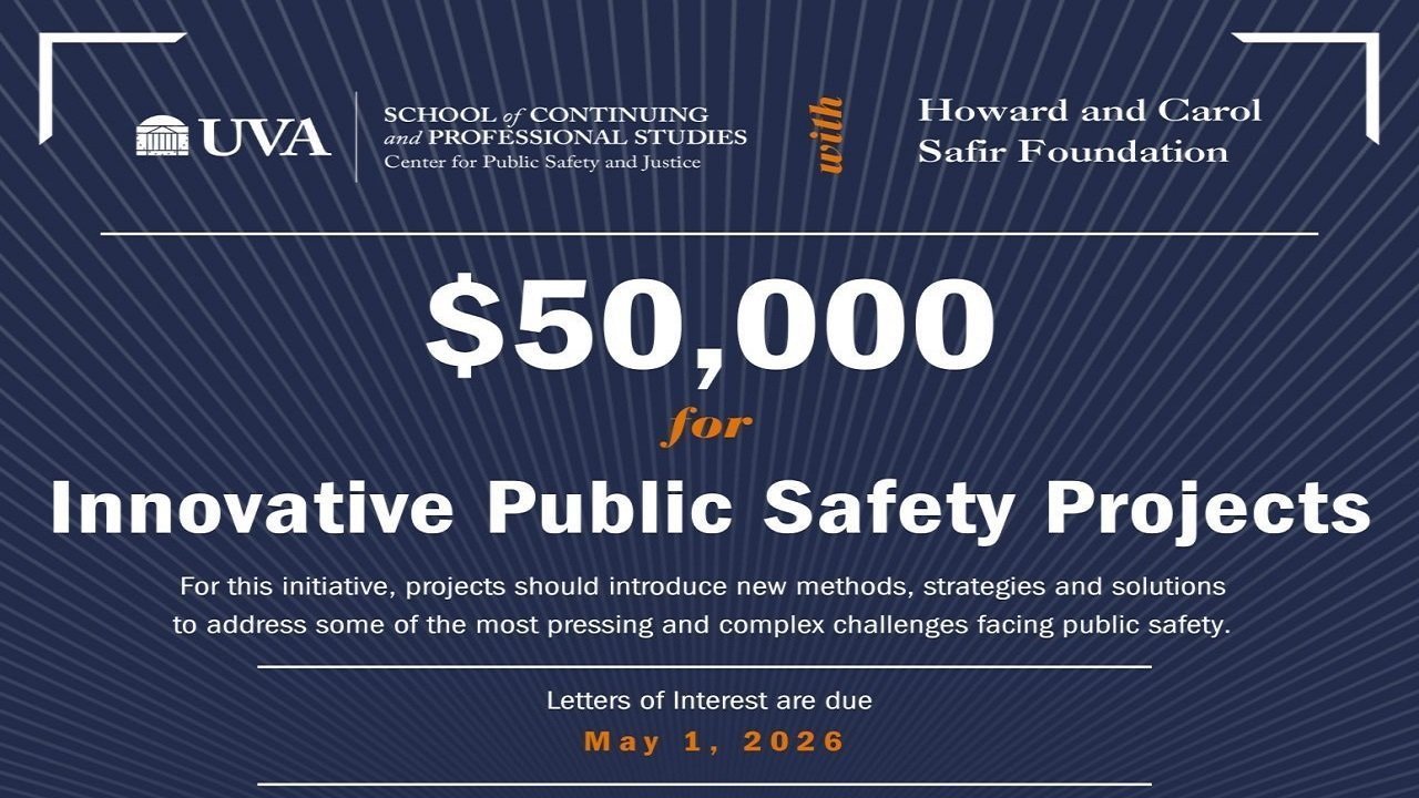 The University of Virginia’s (UVA) Center for Public Safety and Justice (CPSJ) is pleased to invite proposals for the Howard and Carol Safir Foundation (HCSF) Public Safety Initiative. This initiative is designed to support forward-thinking innovation in public safety. We seek projects that address long-standing, current, or future public safety challenges and extend beyond traditional approaches and introduce new methods, strategies and solutions to some of the most pressing and complex challenges facing the field. Priority will be given to proposals that test, pilot, or refine innovative practices with strong potential to generate meaningful, measurable improvements in public safety outcomes.