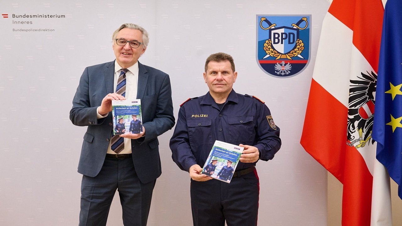 Section head Martin Netzer and Michael Takacs, Federal Police Director, present new brochure “Safety at Schools”.
